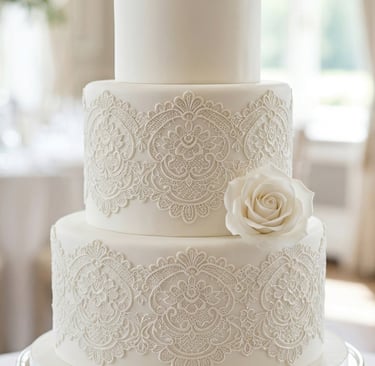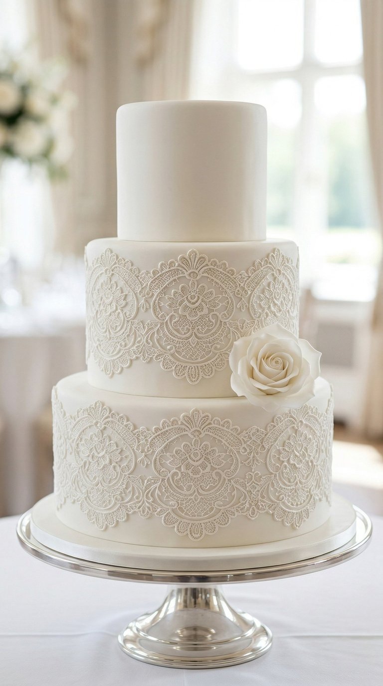 Intricate lace patterns pressed or piped onto fondant, often matching the bride's dress. This bespoke technique bridges the gap between fashion and culinary art, allowing you to replicate the exact Chantilly or Alençon lace from your gown directly onto your dessert. To achieve this seamless match, simply provide your cake designer with a clear fabric swatch or a high-resolution photograph of your dress during your initial consultation. Because this textural design is so visually intricate on its own, it serves as a stunning standalone feature that requires very few additional decorations. If you do want to add florals, it pairs best with a highly restrained, minimalist approach—perhaps a single, statement sugar bloom—to ensure the delicate lace craftsmanship remains the undeniable focal point.