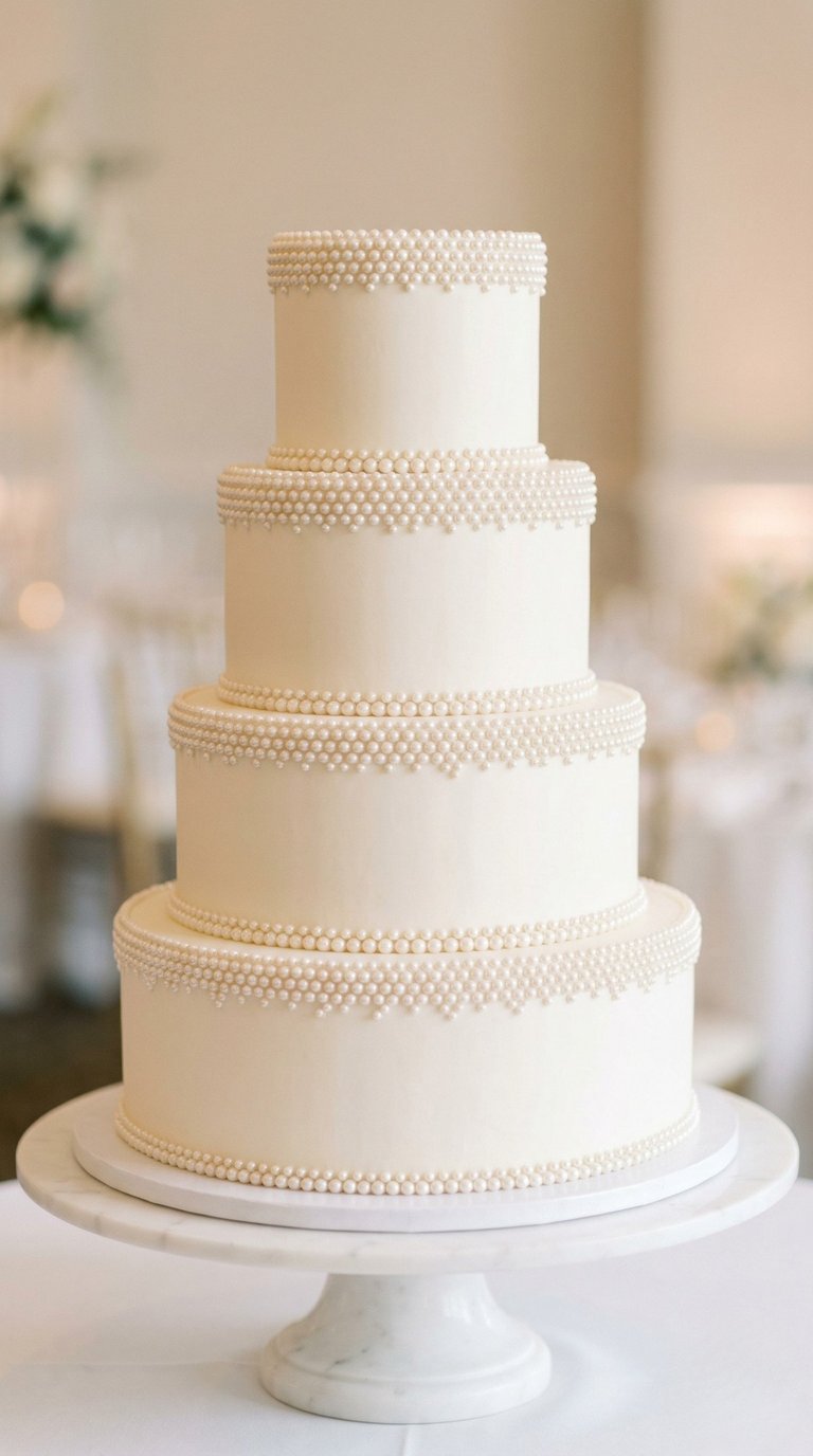Tiny buttercream or sugar pearls adorning the borders of each tier. This delicate detailing adds a layer of vintage sophistication and three-dimensional texture that catches the light beautifully, making even the simplest white cake look extraordinarily luxurious. For a truly cohesive look, consider matching the scale of the piping to pearls found on your wedding dress, veil, or jewelry, creating a subtle visual thread that ties your whole aesthetic together. While often seen in classic white-on-white, this technique also looks stunning when rendered in edible metallic gold or silver dragées to inject a touch of glamour into your reception. When planning your photography list, be sure to request a close-up detail shot of this intricate workmanship, as it is a subtle nuance that deserves to be highlighted in your wedding album.